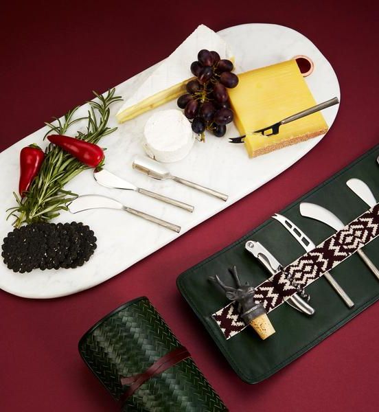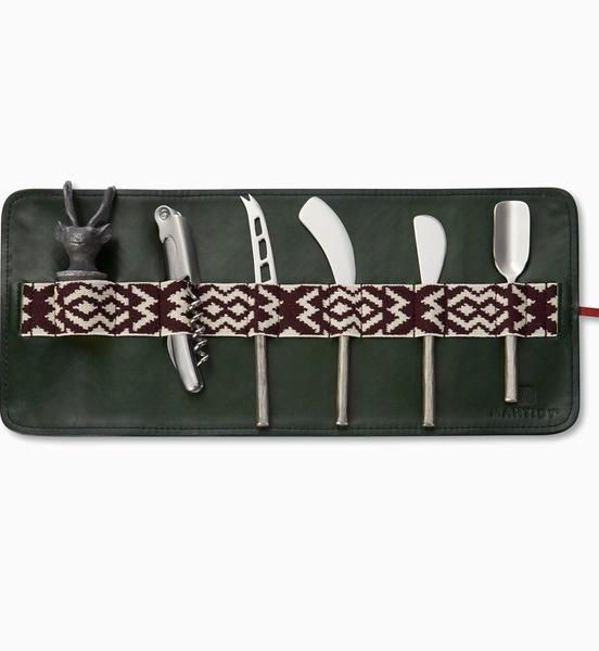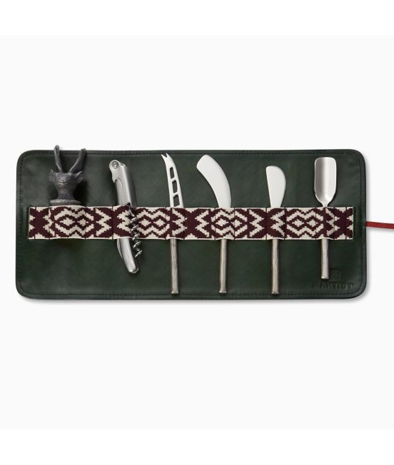 This is the ultimate in picnic accessories or for the home, a cheese & wine roll in green leather, featuring cheese knives, butter knife, wine bottle stopper, chutney spoon and corkscrew. Each of these tools is a robust and ergonomic design that feels great in the hand. Wrapped in a superb luxury green herringbone leather case with strong cream and bordeaux elastic hoops to keep everything in place. This is an exclusive travel accessory with bags of style, making it an excellent present for any occasion.