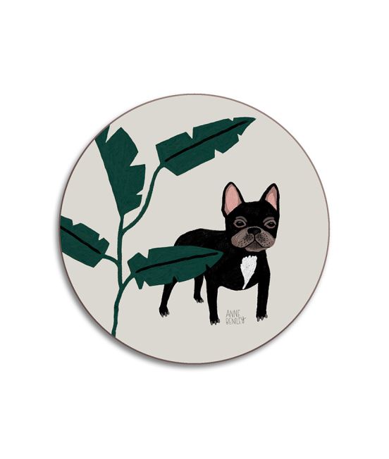 French bulldog coaster, 10 cm round featuring a charming illustration of a French Bulldog, one of the most loved big earred francophones.