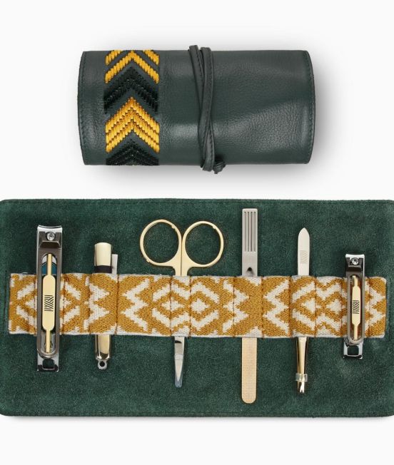 The ‘Mantidy’ Grooming Roll in British Racing Green and yellow leather is an eyecatching, feel good travel set containing a premium manicure set, with all that’s needed to keep nails under control. Contains small and large nail clippers, nail scissors, penknife, nailfile and tweezers.