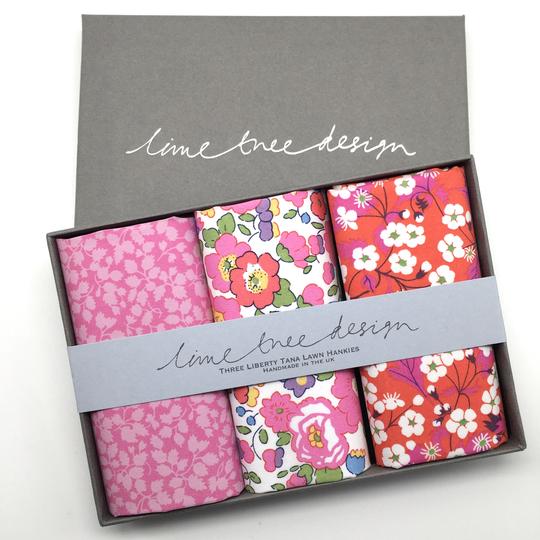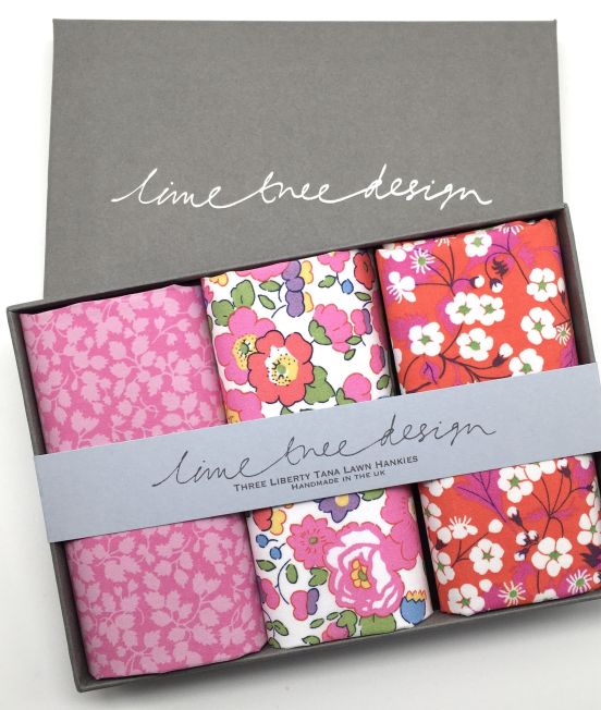 This Pink Panther Hanky Pack contains 3 cotton handkerchiefs, each made from a Liberty design fabric in a presentation box. Something beautiful and convenient for your handbag.
