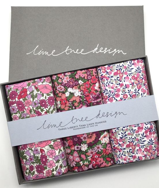 This Tickled Pink Hanky Pack contains 3 cotton handkerchiefs, each made from a Liberty design fabric in a presentation box. Something beautiful and convenient for your handbag.